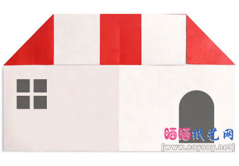 非常简单入门级的红白相间小房子折纸,还有窗户和房门。