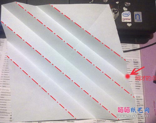 4.折过来后,如图记录右边的交叉点(其实就是这张纸的1/3点)