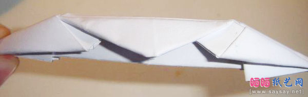 12.再将此时折纸模型的上部两个面的顶角向前后两个方向进行翻折。即形成了如图所示的顶部水平的折纸结构。这个时候由于已经进行了连续的折叠,所以折纸模型的折叠操作会稍微变得有些难,但是这并不妨碍继续折叠,如果选用的纸张薄一些的话,折叠起来会更加的轻松。