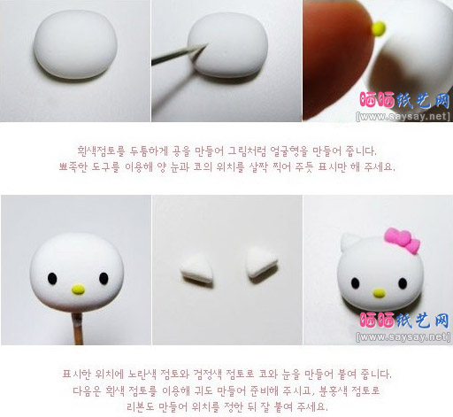 “KT控”可以说明hello kitty 多么受女生们的欢迎了吧,很多都是伴随着成长的一只可爱小猫咪。即使很多女生成人之后依旧会很喜爱的。以至于家中到处都是布满了各色的hello kitty物件。对于喜爱手工的我们来说怎么能不亲手打造一只可爱的hello kitty呢? 其实hello kitty一点都不复杂,结构造型都是很简单的,比我们平时做的那些软陶手工都要简单呢。 我们需要白色、黑色、粉色、黄色四色的软陶粘土。剩下的就按照图片上的例子一点点的动手制作就好了呢。