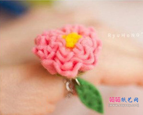 这样漂亮的不织布小花就做好了,再在后面粘上戒指圈就可以了,戒指圈可以根据各人喜好用金属或串珠的都很漂亮。看另一款:布艺玫瑰花戒指手工制作教程