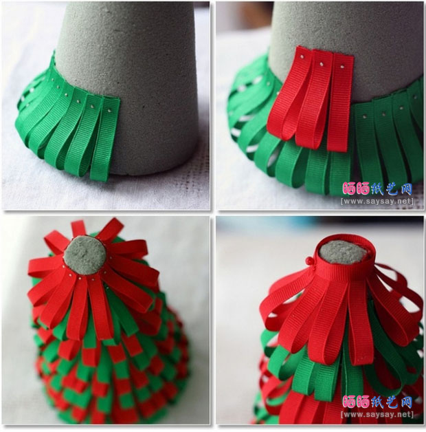 布世圣诞树的制作方法比较简单了,就是把丝带剪成大小一样的长度,然后一个个钉上去就好了。大家看图片一下就懂了。