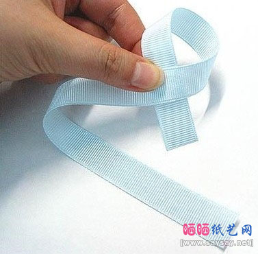 步骤一:利用双胞胎折法来制作彩带花。抓住彩带的一端制作一个环。
