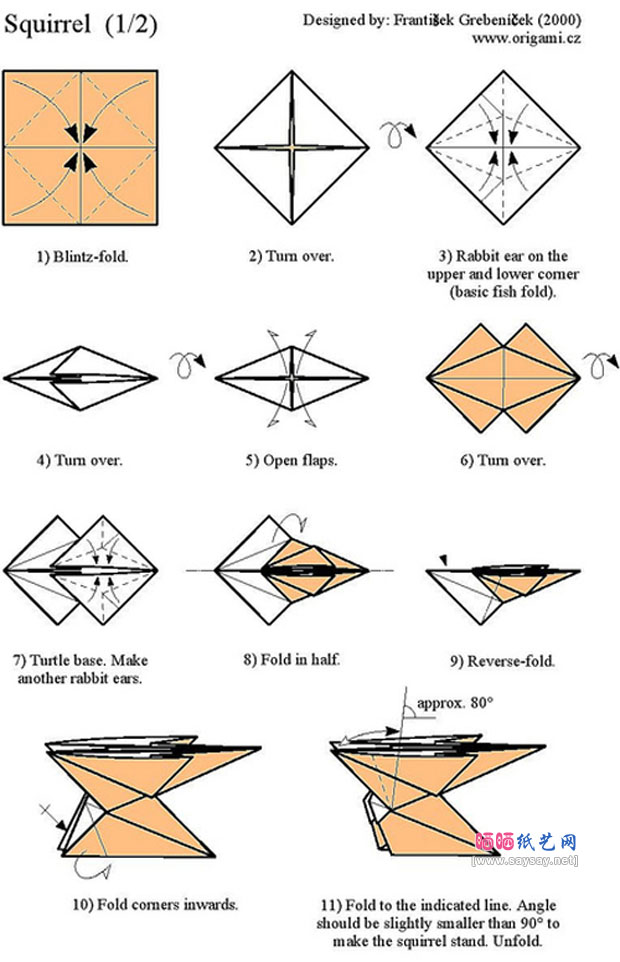 这个手工折纸松鼠的教程虽然着重的将折纸松鼠的大尾巴展现了出来,但是因为考虑到制作步骤的简单,折纸松鼠的头部还是进行了较为简单的整理,没有太多夸张的成分在其中,基本上也算是将折纸松鼠可爱的一面展示了出来。这个较为容易上手的折纸松鼠教程是由Perry Bailey设计的,清晰简明的图谱使得整个折纸操作变得容易了许多,为了能够制作出真实松鼠的感觉,建议在折纸纸张色彩选择上面选择棕色或者是橙色比较好。