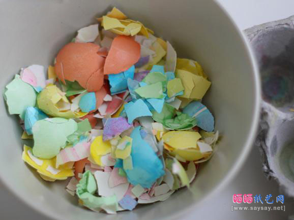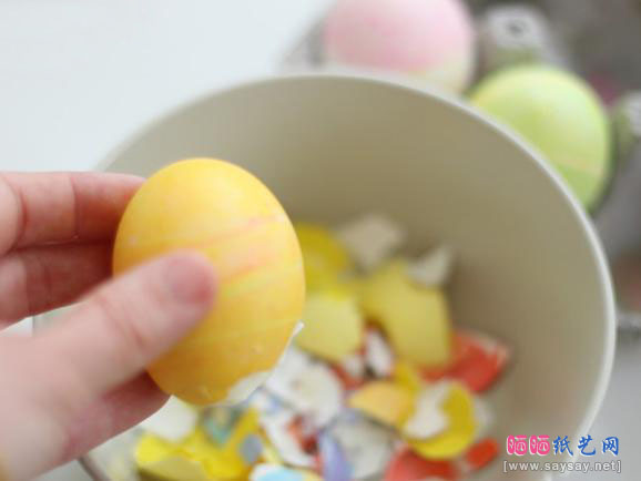 第八步:干净的蛋壳上色,压成碎片