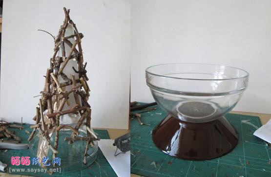 6、取下玻璃碗,把粘贴好的树枝正面朝上放在第二碗里。添加更多的分支结构。请记住,这个是圣诞树的根基,所以一定要做到稳定,上下两层粘贴到一起,下面的只要沿底下的碗进行粘贴,最后封闭边缘的分支,把他们做成封闭性的就完成了。