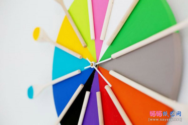 步骤6:相同颜色的木勺使用强力胶粘在颜色相同的钟面等分格边界线上