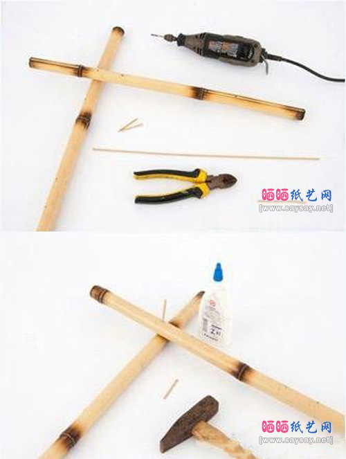 1、在竹子得顶端和每节的交汇处喷涂上棕色的颜料等待干燥,然后把两根竹子垂直摆放在一起,位置为整根竹子的1/4至1/5的处,在交叉的位置,两根竹子上打孔,准备铁丝一段,长度为两根竹子叠放在一起高度的3倍,铁丝穿过两个孔