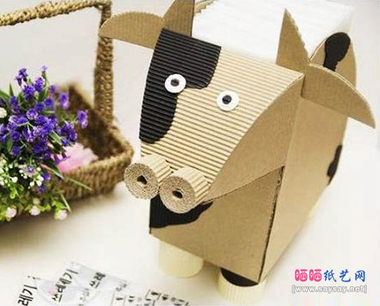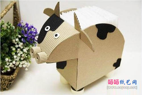 9、最后你只需要把纸巾放入到盒子里,瓦楞纸手工制作非常漂亮的奶牛纸巾盒完成。