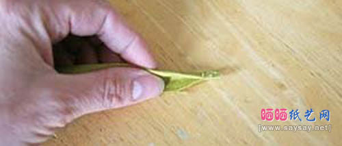 3、卷好以后在尖端在滴上胶,把布条向下折,开始滚动第一折。