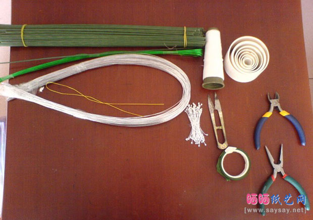 这里需要的是24#银色和绿色铁丝,绿色、粉色丝网,绿色胶带,白色中珠光花蕊一把,2#花杆