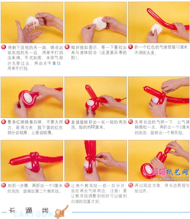 美乐蒂是三丽鸥公司根据投票,选出大野狼最爱吃的动物,根据小红帽的点子创造出来的卡通形象。漂亮可爱的造型一直是很受小朋友们的喜爱,今天晒宝纸艺网小编就给大家分享用气球制作美乐蒂的方法。