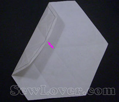 3. 以相同的手法折进相邻的第二条边,两条边中间重叠的三角部分就形成了花瓣的雏形,接下去就要将它折成我们需要的模样:首先将重叠的两个三角分开朝向两边对折,如下右图会形成两个角: