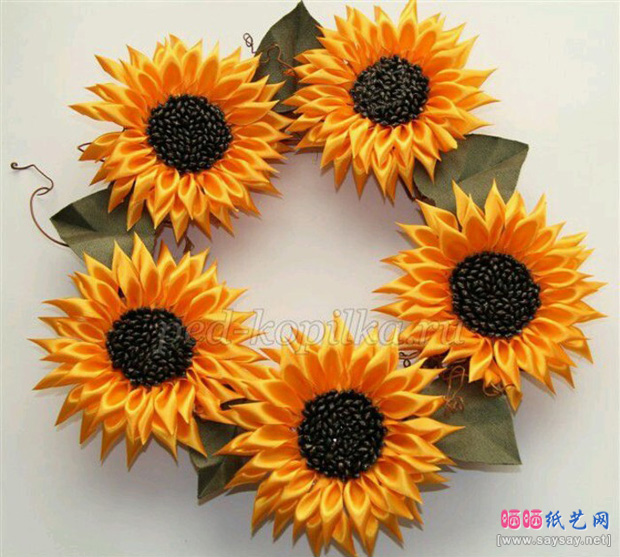 向日葵的花瓣部分是用金黄色的绸缎来制作的,但是内部的果实是用真是的瓜子来制作的噢。这也是这篇文章在旧物改造的原因。大家需要现将绸缎剪裁成一段段的小段。然后将它们两端按照图片上的方式粘合在一起。