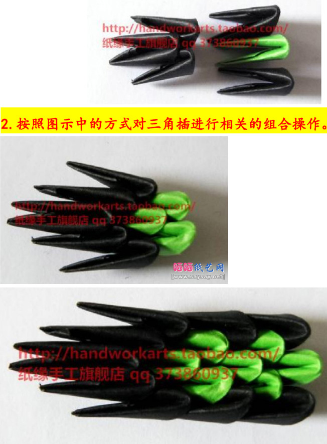 整个制作需要使用到286个绿色三角插和126个黑色(当然颜色可以根据自己的喜好选择)三角插,具体制作过程只做参考: