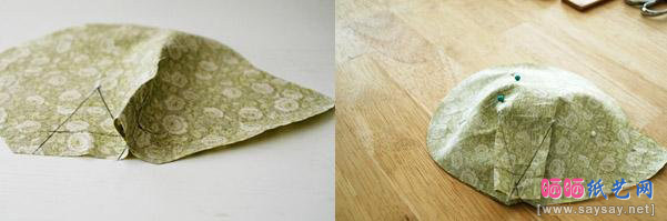 3、缝合两个三角形的边缘,如图2把缝好两个三角形向两侧平衡的摆放,这样我们得到了接近半圆形刺猬的身体部分。