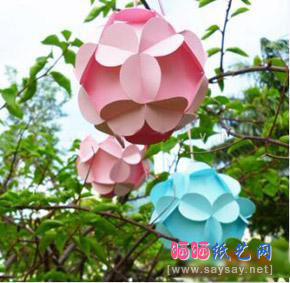 用几个相同的形状的卡纸穿插而成的美丽花球,既可以装饰家里,又可以用它来装糖果、小首饰之类的小物件,很有创意也很有心意的礼品盒。