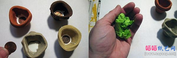 2、把果冻盒放在水里煮一下,变软后捏出各种很艺术的造型,等待干燥后,里侧和外侧涂上暗色的丙烯酸,环保生活用纸剪下一块约5平方,用手揉搓一下。将皱巴巴纸巾放入果冻盒里,在果冻盒子涂上胶水,每个花茎底部在涂上插入花盆。