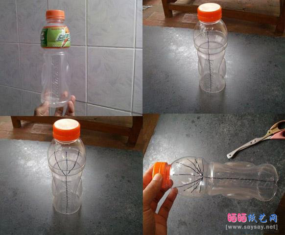 准备材料:塑料瓶、剪刀、丙烯颜料、记号笔
