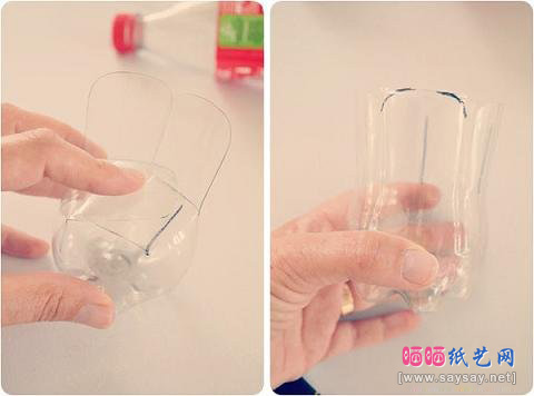2、沿所画的线剪开,注意底下要留出高5cm的瓶底,这样瓶身成了5瓣,把5个瓣的边缘修剪成椭圆形。