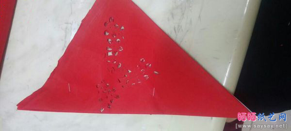 第1步:将正方形红纸对角线对折,折出来的形状是三角形。