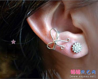 4、剪掉蝴蝶结多余的部分,两端铁丝的尾端弯折出小的圆圈形,把三折的主体铁丝根据耳朵的厚度,弯折扣在一起,铁丝手工制作可爱蝴蝶结耳钉完成,晒宝纸艺网小贴士:在弯折小圆圈的时候你可以借助圆珠笔来完成,简单的缠绕,立马拥有漂亮的小耳饰,更加的适合没有耳洞的MM哦!