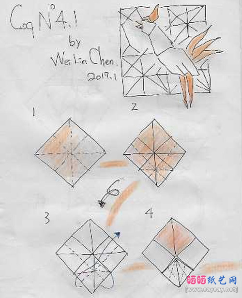 公鸡是很勤劳的家禽,每天天边刚露出一点曙光它就开始啼叫。今天晒宝纸艺网带给大家的是一只正在啼叫的公鸡折纸。